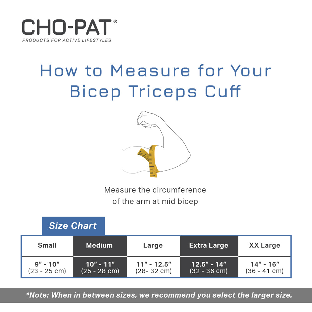 The Cho-Pat Bicep/Triceps Cuff applies dynamic circumference pressure to the upper and lower portions of the bicep and triceps muscles. This action spreads out the stress and direct pull on the muscle attachments which helps (1.) to reduce the likelihood of developing bicipital tendinitis/tendinosis or tricipital tendinitis (2.) to ease existing bicep/triceps’ pain and discomfort.